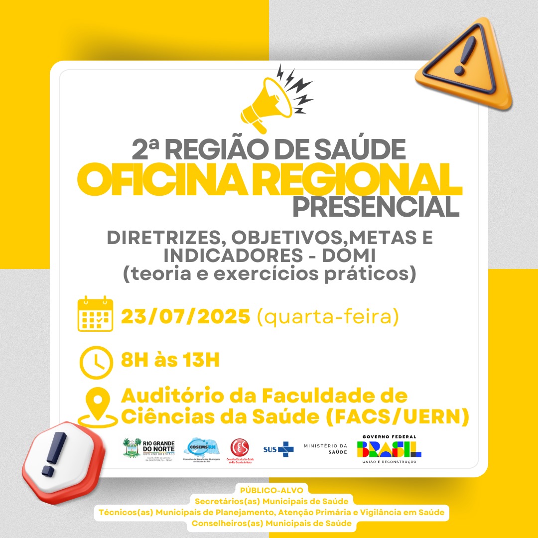 O encontro acontecerá no dia 23 de julho, no Auditório dos Ambulatórios da Faculdade de Ciências da Saúde (FACS/UERN), em Mossoró. A proposta do evento é fortalecer o planejamento em saúde nos municípios, alinhando estratégias para melhorar a gestão do Sistema Único de Saúde (SUS).
